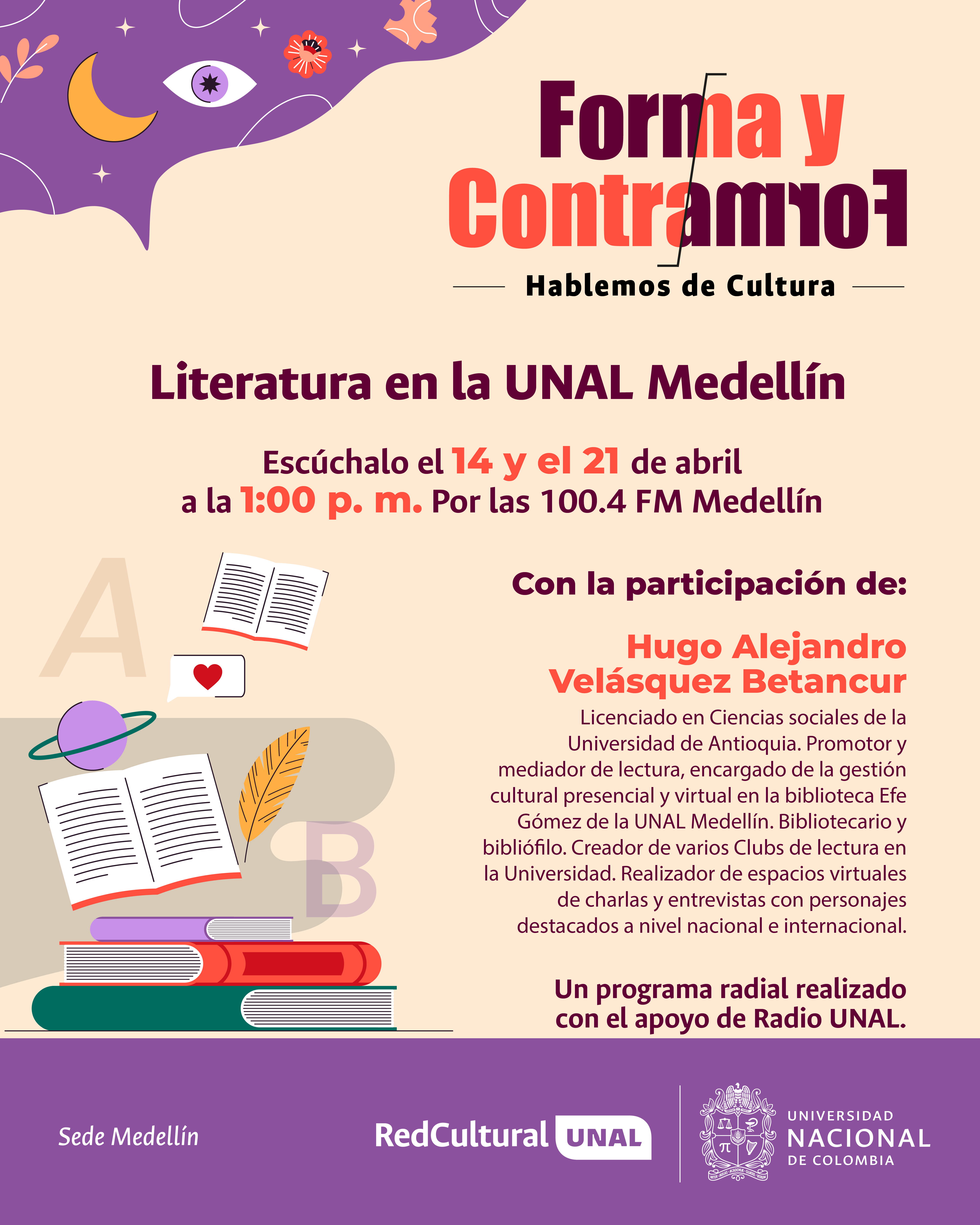 Alejandro Velásquez quién es licenciado en ciencias sociales de la Universidad de Antioquia, promotor y mediador de lectura, encargado de la gestión cultural presencial y virtual en la Biblioteca Efe Gómez de la UNAL Medellín, con experiencia en la elaboración de proyectos y estrategias que tienen por objetivo de motivar la pasión por la lectura y mediar entre lectores y lecturas. Compartimos también textos de seis escritores y escritoras de las seis regiones del país en el marco de la celebración del día del idioma.