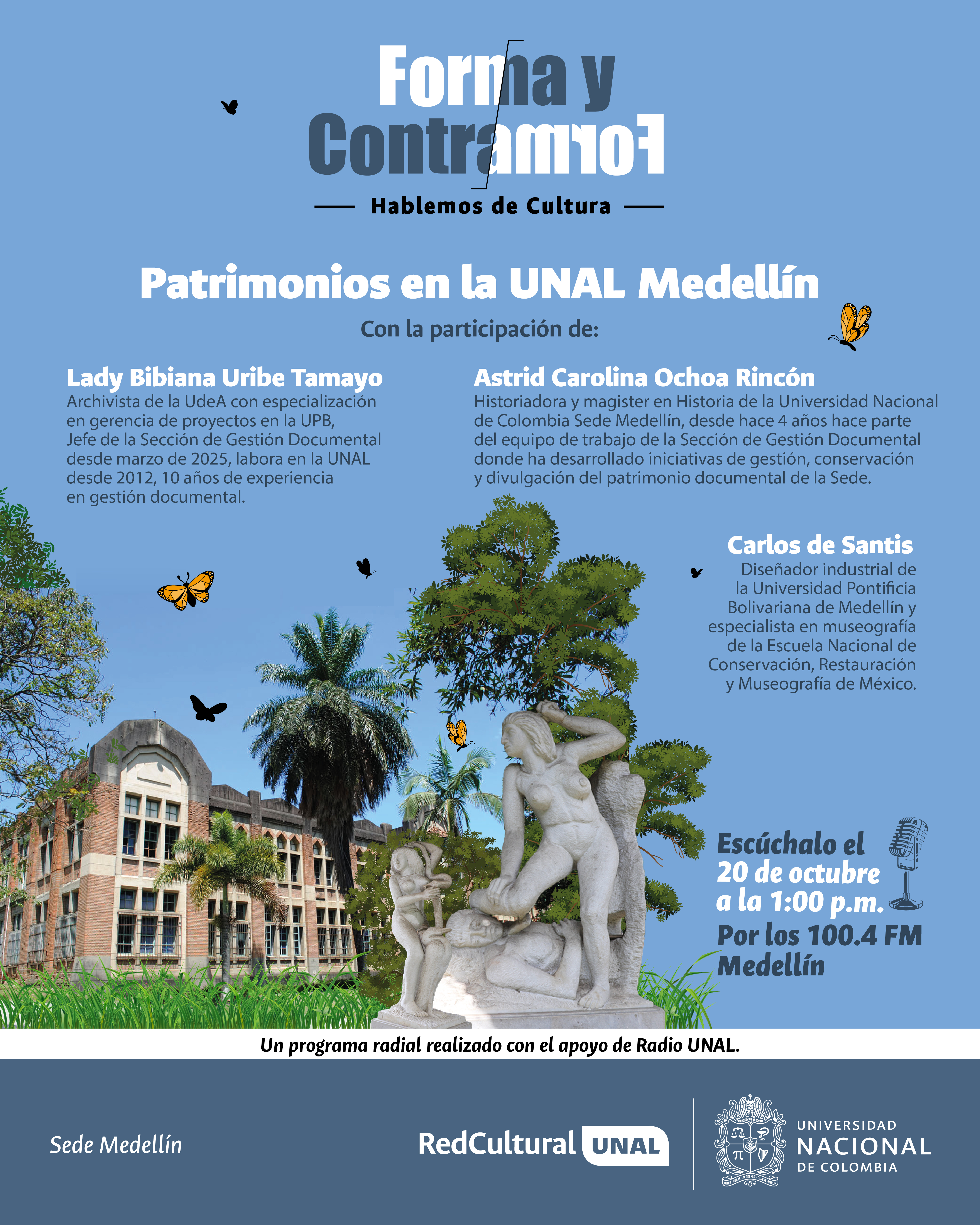 En este episodio conversamos con Lady Bibiana Uribe Tamayo, jefe de la Sección de Gestión Documental, Astrid Carolina Ochoa Rincón, Magister en Historia de la Universidad Nacional y Carlos de Santis Museógrafo de la Escuela Nacional de Conservación, Restauración y Museografía de México. Hablamos sobre los proyectos del nodo Patrimonios de la UNAL Medellín en el año 2025. La exposición "La UNAL en Medellín", el recorrido patrimonial "Cuidar el pasado para construir el futuro" y el curso Patrimonios UNAL: una experiencia memorable.